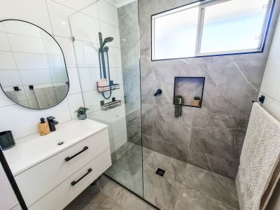 luxurious bathroom. This amazing space offers a spa-like experience with a more beautiful marble tiles , a huge glass screened walk in shower, plus floating vanity, stunning black fixtures and fittings throughout and a beautiful on-trend oval vanity mirror. With all this plus built-in storage and a separate toilet this is the whole package and then some. To top off property has an internal laundry with masses of storage options plus room for a washing machines, and a pull-out washing line.