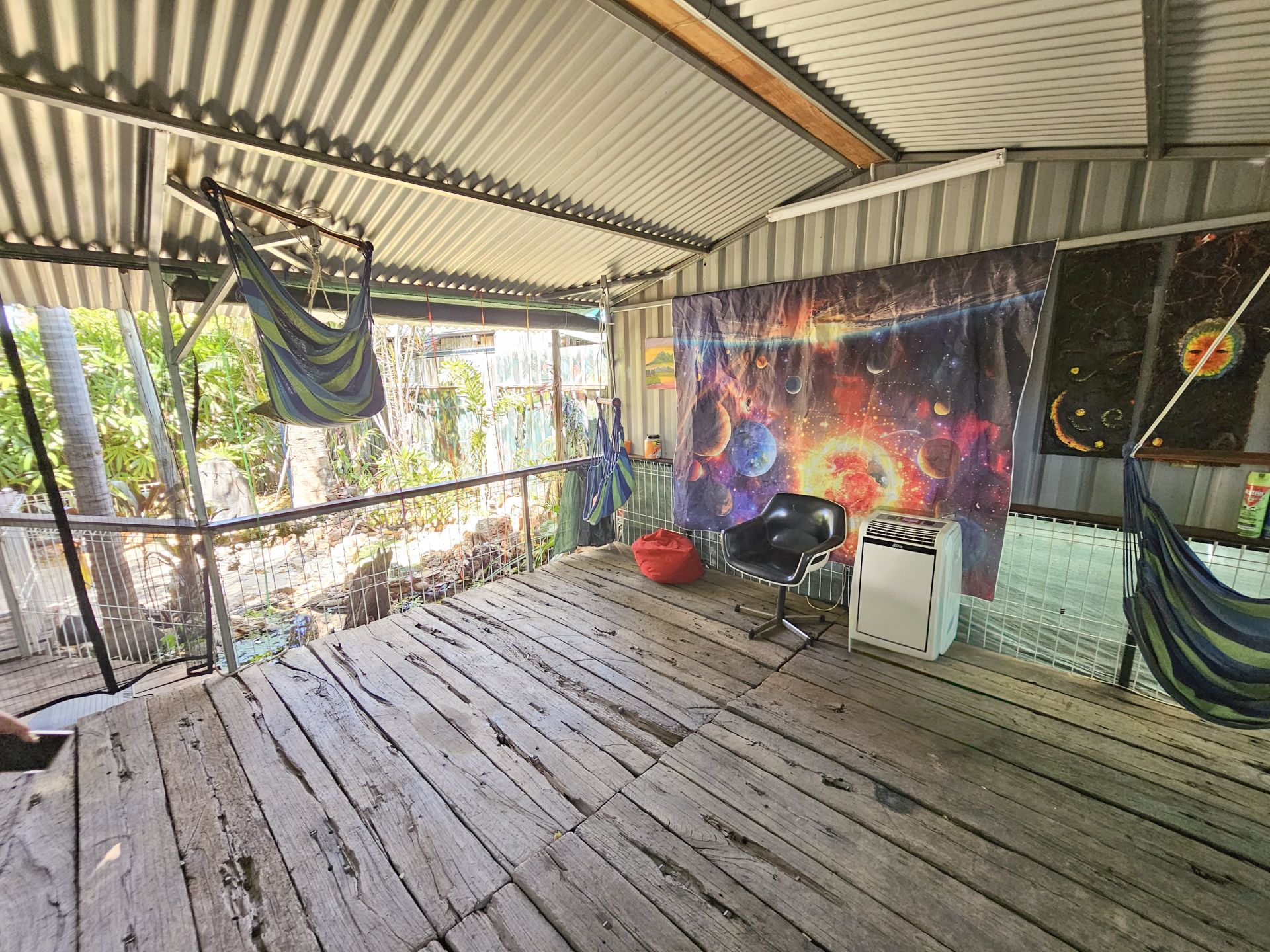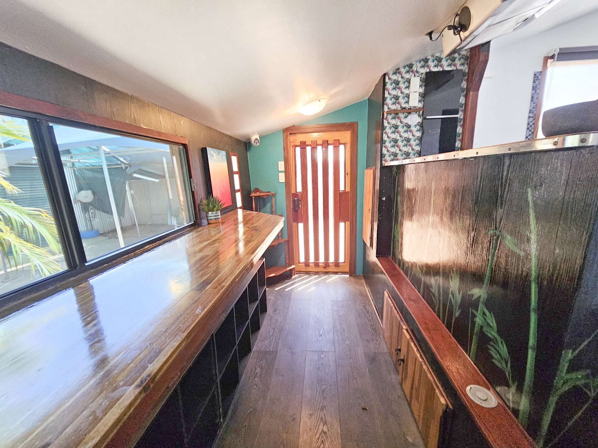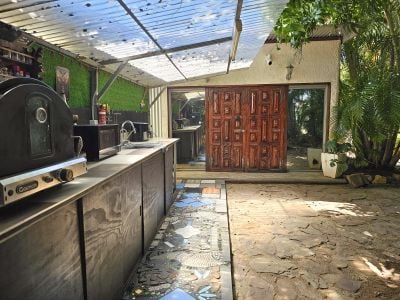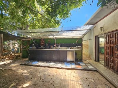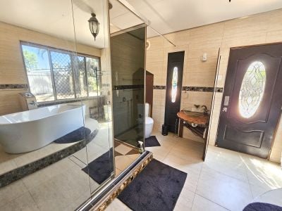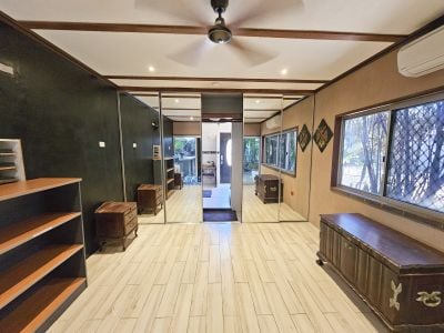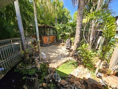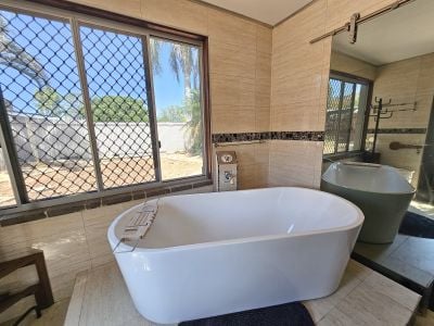 And just down the driveway is the second residence. This excellent granny flat offers the most sumptuous of bathrooms with dual head shower and a huge bathtub looking out over the back yard. The bedroom/living space is full of charm with full sized glass sliding doors opening out to a tropical oasis with your own alfesco cooking and laundry areas, plus lush gardens with loads of fruit trees.