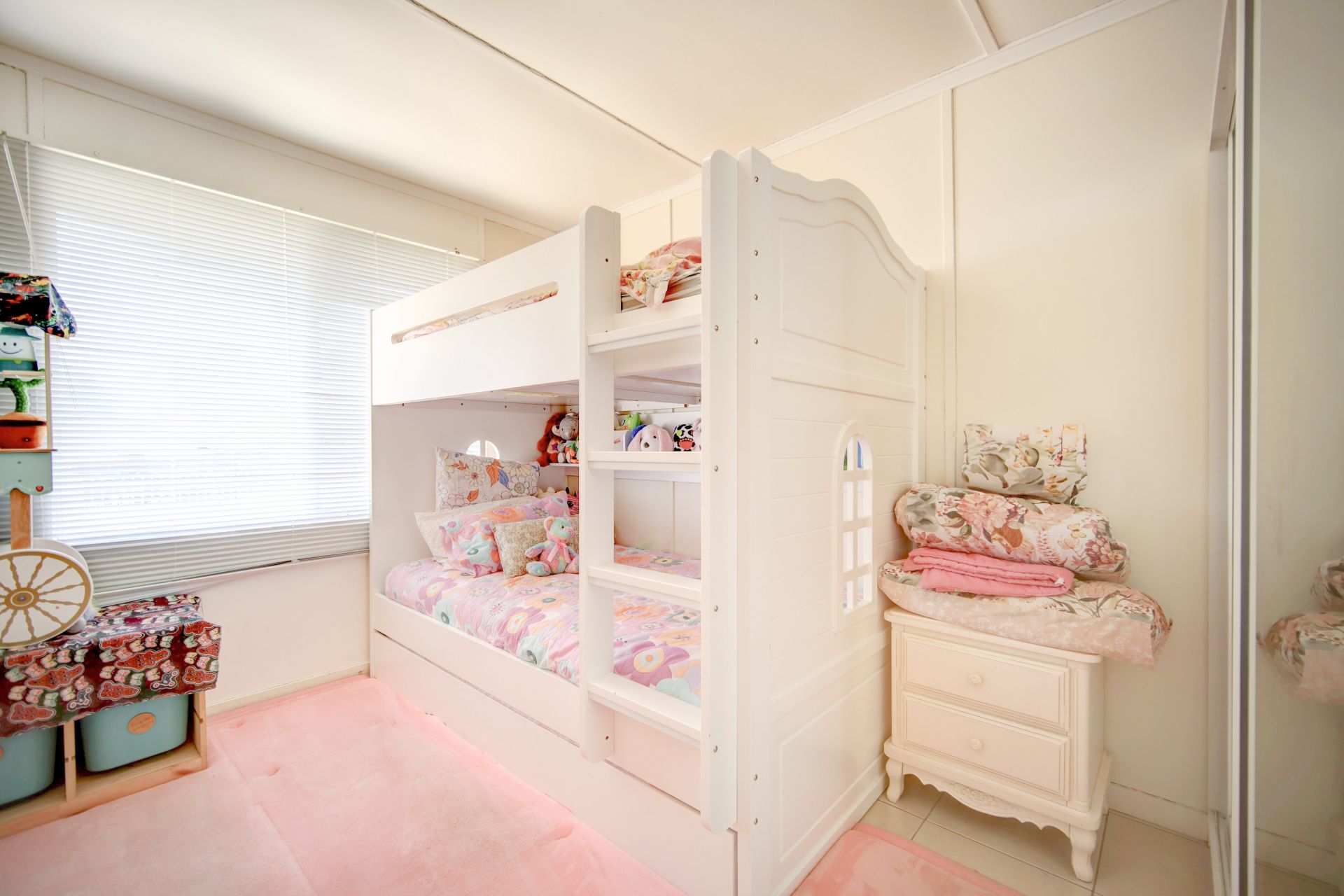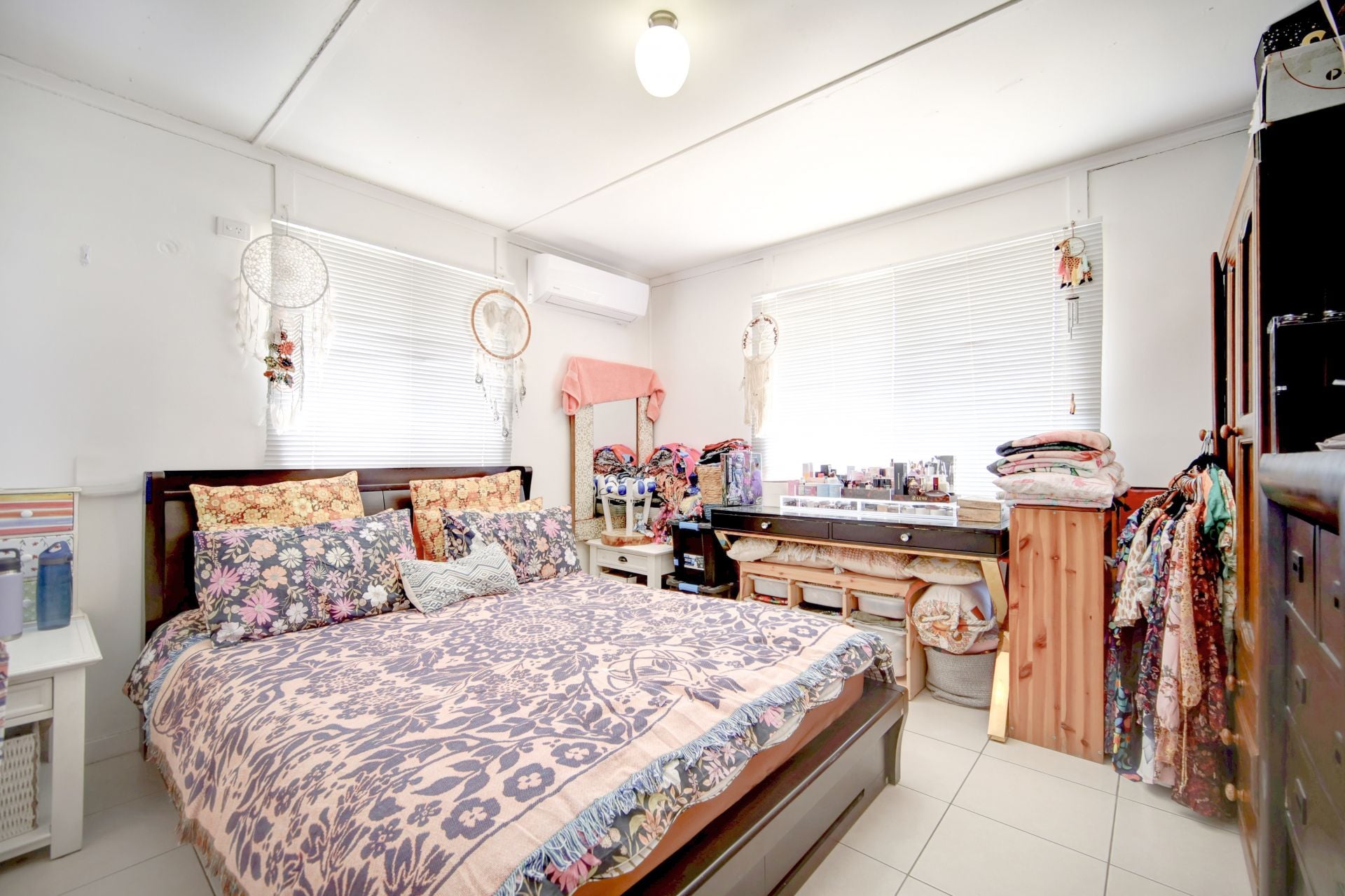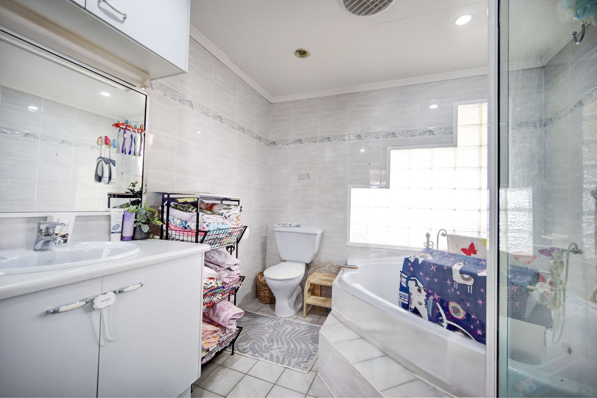 The three tiled bedrooms, each with split system air conditioning, provide comfortable retreats for the whole family and with an extra fourth bedroom/ study there is room for everyone here. The tiled bathroom features a corner spa, separate shower, vanity and toilet, offering a luxurious bathing experience.
